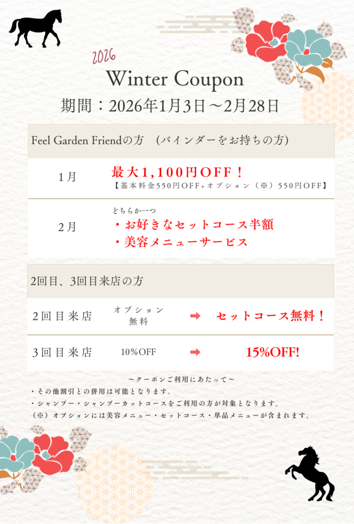 日頃の感謝を込めまして、Feel Garden公式ラインと友達登録を行っていただいているお客様全員に、ウィンタークーポンの配布を行わせていただきます。